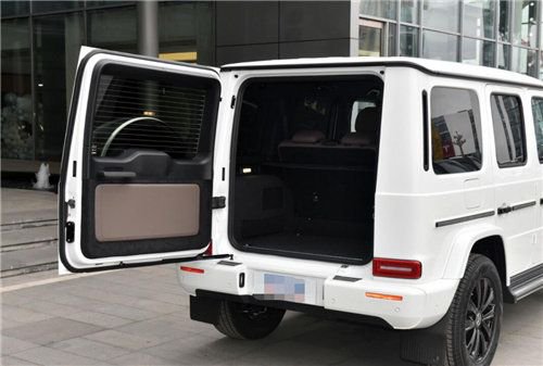 23款奔驰G500的后备厢门依然是侧开式设计,把备胎挂在尾门上,野味十足。新车后侧窗和后车窗的采用深色隔热私密玻璃,私密性更强。