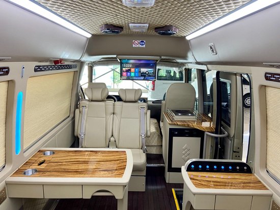 丰田考斯特改装商务车的改装设计不仅仅只是体现您的高贵身份,更是为了给给您的商务旅途带来方便,因此在设计上我们更考虑了您在办公中的所有需求。在车顶处添加LED灯,方便您在旅途中观看书籍或者工作材料。高档办公桌双人汇报新,并且配备了方便的电脑以及手机充电接口,方便而又安全。