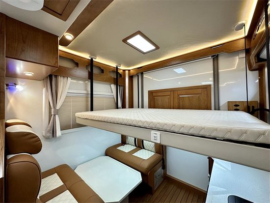 下面我们看看室内的空间分布吧!车内采用实木风格家具+游艇级防水抽木地板,车门为中开门设计,左侧为休息和卫浴区域,右侧为会客和厨房区; 箱体内部和驾驶室是相互贯通,可以防止紧急情况的发生,前部设计有投影幕布,并且搭配了G9S投影仪+JBL音响系统,让你在房车中也能体验出电影院的感觉。