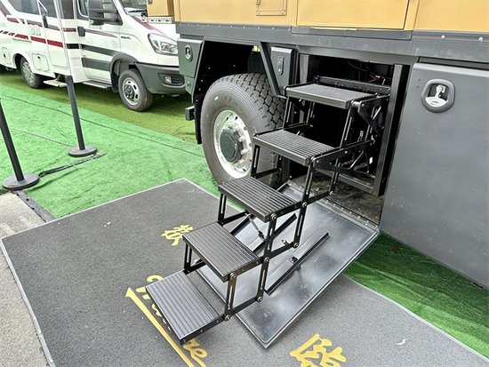 首先外观上,单看大体外观其实与大家想象中的越野重卡房车看上去没什么区别,但细节上还是有所不同的。刀刻斧凿的厢体后面,车尾部的拓展结构使用的是具有独家专利的盒式结构的拓展仓,越野与越野也是有这些细节不同的。车身外尺寸为5995x2530x3890mm(根据选配装置有所变动)最大总质量14000kg,核载6人。