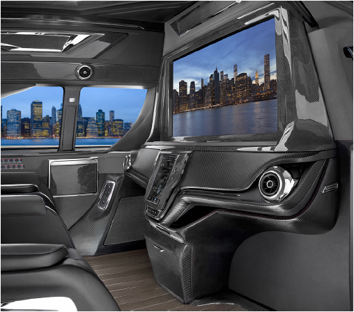 GMC商务车商务中不失科技感,大型瀑布式中控台、非对称式侧墙造型、后排流线型护围、悬浮式扶手台、顶级Harman音响、40“液晶电视、4G移动Wi-Fi、视频会议系统、车载电热水壶、电动折叠桌板、豪华车载冰箱、內镶式电动酒柜、前后路况监视系统,车内电器均可由液晶触摸屏控制,商务功能一应俱全。