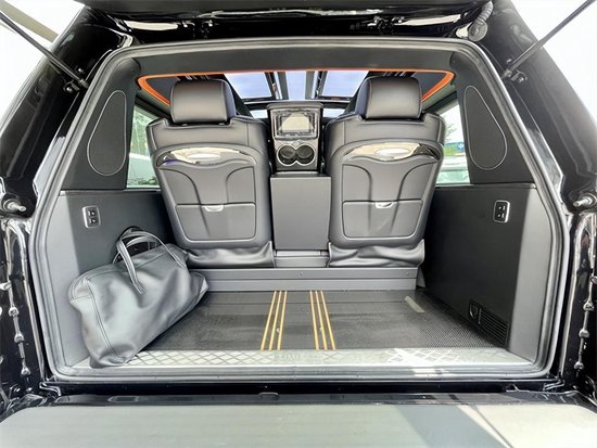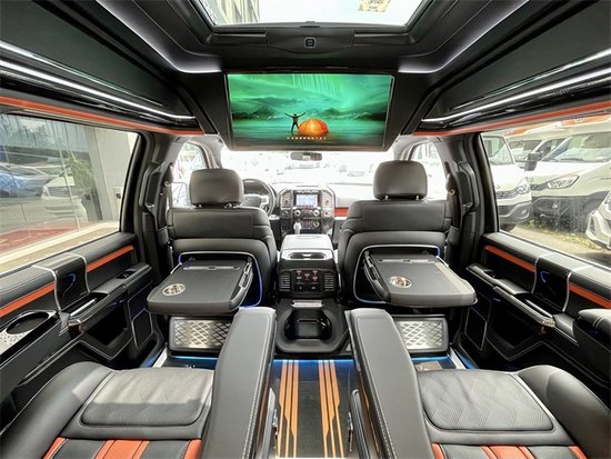 二排的座椅采用上等牛皮包覆的航空头等舱座椅,通风加热气动按摩,16项电动调节,一键躺平足足可以伸展至135度之多。坐在如此舒适的座椅上,抬头就能看到越野行宫的专属定制顶灯,地板部分采用的是碳纤维风格的地板,档次十足。无时无刻都彰显着您身份的象征,威武且霸气~本款高顶定制款福特勇猛者不管是用于越野出行,商务办公,家庭出游都能完美完成,车内总体空间感十分宽敞,适用于商务接待或家庭旅行。