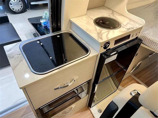 厨房区与卷帘门隐藏式卫生间整合在一起,虽然这只是一辆B型房车,但是双开门85L冰箱,镶嵌式电磁炉和带盖式专用水槽,都能保证您在忙完手头的工作之后回到车内可以吃上一口热乎的食物。洗菜池旁的小桌板拉开之后可增大操作区的空间,这样的厨房系统可满足2-3人5-7天的生活需求。