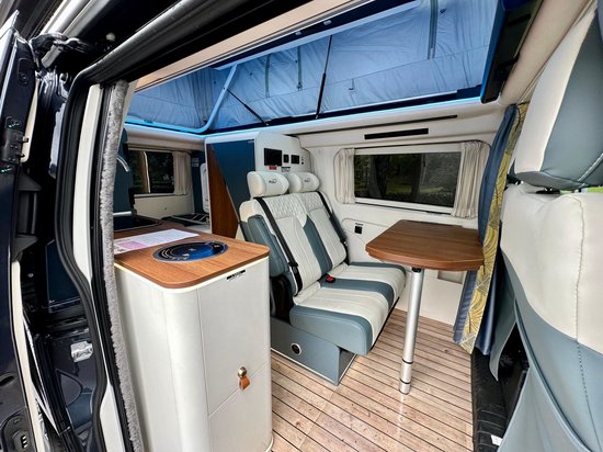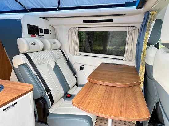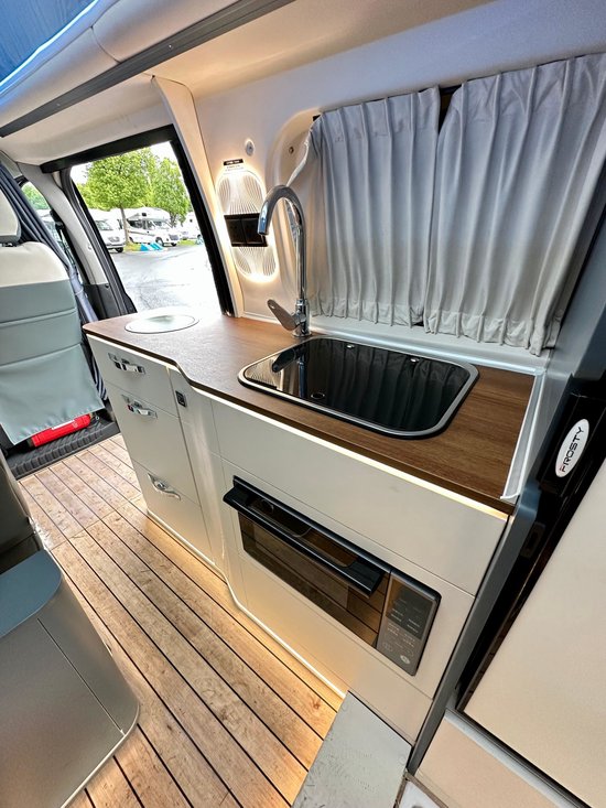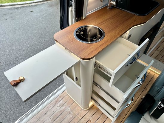 会客区配有单排双人座椅,座椅外侧还配有乘车扶手,能够为你带来很好的乘坐体验。前方是一张尺寸适中的餐桌,在这里办公、就餐都没有问题。旁边的车窗搭配了隐私帘,能够很好的保护乘客的隐私性。厨房位于中门区域,操作面积还是比较大的,在这里烧点热水,做个简餐基本够用了。配置方面主要有电磁炉、凹型水槽和房车专用冰箱,同时该区域还设计了较多的储物抽拉柜,大大的增加了整车的储物功能。