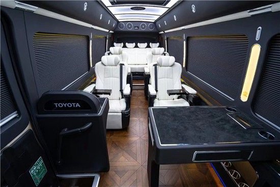 丰田考斯特的内饰改装上可以说是奢华备至,全封闭间隔,5.1声道文娱影音导航系统,32寸车载专用液晶显示屏,空客A380顶棚,原装进口埃尔法 (配置|询价)座椅,首长席办公桌,报告席办公桌,秘书席办公桌等等,肯定的陆地领航商务招待的模范。考斯特窗帘可以选择豪华的布艺窗帘或舒适的百叶窗帘,百叶窗帘可以选择是手动的还是自动的,加装窗帘装饰框等,更加贴合顾客的需求;地毯可以选择通道地毯或全车加装木质地板,选择自己理想的风格。