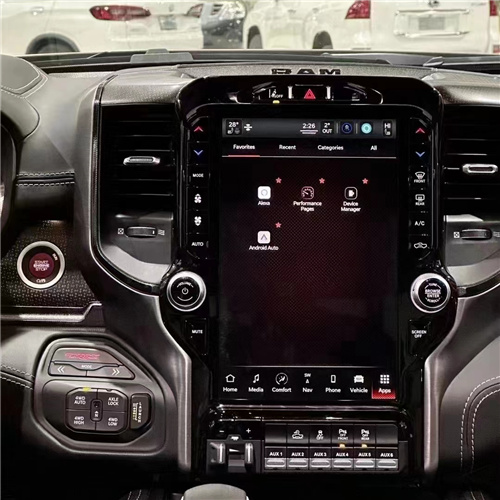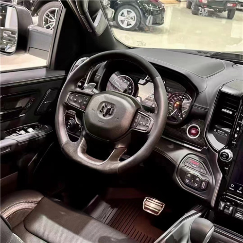 23款道奇公羊霸王龙TRX在内饰部分进一步强化了其高性能版本的形象,中控台和座椅随处可见的TRX标识便是最好的例证。同时,作为道奇家族的旗舰车型,新车还配备了12英寸竖置中控屏幕,除了支持蓝牙、导航和车载Wi-Fi等常见功能,还支持Apple CarPlay和Android Auto手机映射。