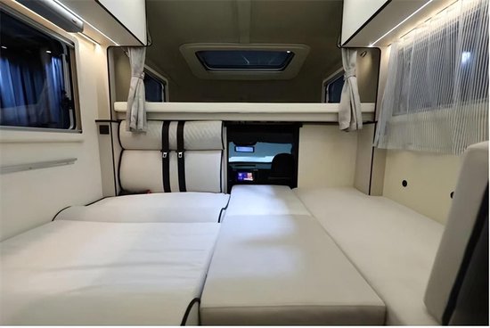 会客区采用了经典的对座沙发+升降桌的布局,同时还是多重睡眠功能区,自由炮C配备了两张超大床铺。尺寸分别为:1.9m*1.7m,1.9m*1.4m。大空间的实用感受,也是完全符合其产品定位,更亲近家庭的旗舰布局,6人旅居皮卡房车。