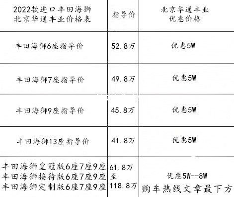 北京店丰田海狮座位数5座6座7座8座9座纯进口车型,(华通丰业)均匹配了3.5L汽油发动机,变速箱为6速自动。(华通丰业)丰田海狮的6速变速箱!每档的切换非常平顺而且动力迅猛,高速超车觉对没压力。新丰田海狮为国六排放标准 车身重量: 2530 kg 轴距: 3860 mm 轮距(前/后): 1675/1670mm,长: 5915 mm,宽: 1950 mm,高: 2280 mm。