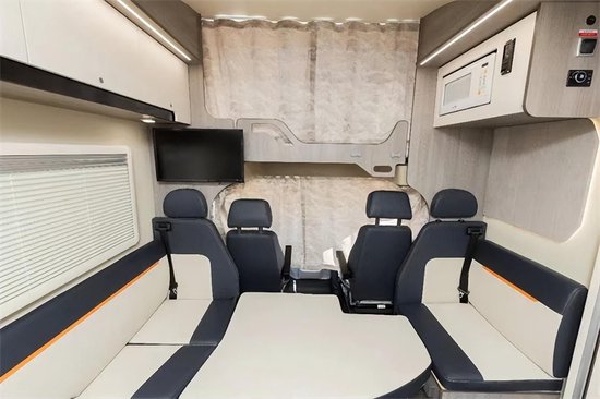 会客区使用L型的卡座沙发设计,布艺加上皮革的面料设计,好打理的同时可以让乘坐时更加舒适透气。气动式升降桌支持四向滑移功能,灵活多变。该车的行驻车底置分体式直流变频空调(DC12V)位于会客区的下方,制冷效果更加迅速、制冷量更大,可以涵盖整个室内空间,行驻车过程中都可以使用。另外,底置设计降低整车高度,提升了车辆通过性。