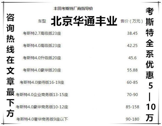 丰田专卖店新款丰田考斯特、9座、10座、11座、12座、13座、15座、16座、17座、19座、20座、23座现车销售, 豪华内饰改装。丰田考斯特12座豪华版商务车,外观设计为米黄金色,车身长7.005米,高大的车身,宽敞的内饰空间,华通丰业丰田考斯特改装商务车在外观上就可以体现出尊贵大的色彩。