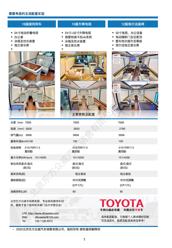 丰田考斯特4S店配置表 4.0高级版42.25W 4.0行政45.6W 4.0升级版47.8W 4.0豪华版55.8W 北京东方众威原创丰田考斯特9座定制版60W-75W 丰田考斯特10座接待版60W-85W 北京东方众威原创丰田考斯特11座VIP版70W-85W 丰田考斯特16座企业版70W-90W 北京东方众威原创丰田考斯特12座接待版75W-100W 房车_商务车_旅居车_中巴车_改装车_客车_丰田考斯特12座埃尔法 (配置|询价)版80W-110W 北京东方众威原创丰田考斯特12座定制版90W-140W 丰田考斯特12座蒙娜丽莎版95W-180W全系现车。购车咨询电话:13911066072汤经理 同微信
