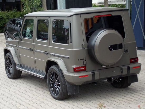 2023款奔驰G500的车尾同样十分方正,矩形的尾灯设计虽然比较普通,但十分有趣,并与前脸形成良好呼应。备胎同样没有被舍弃,当然这也成为奔驰大G车型最经典的标志之一。同时,还加入G500徽标,以进一步展现其身份。