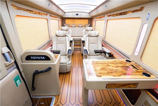丰田考斯特(柯斯达)超VIP至尊高端定制版,该车配备了全亚洲最好的航空座椅(日本原装埃尔法 (配置|询价)座椅),除此以外,华通丰业丰田考斯特(丰田柯斯达)还在舒适性上做了一些实用的配置,如双层(中空)隔热玻璃,丰田考斯特在灯光和车厢氛围方面做了巨大的改善,全车都使用LED灯光,地毯灯,阅读灯,立柱等,航空顶灯,台阶灯,窗帘灯等灯光效果的搭配让丰田考斯特呈现给乘客更加绚丽的色彩。