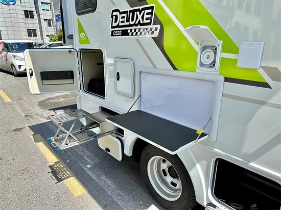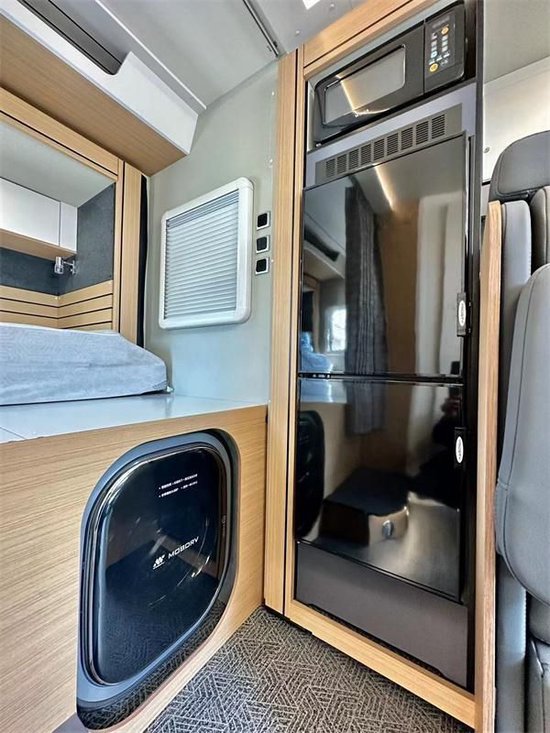 入户门左侧是车内厨房区域,配备了宽敞的厨房台面,台面设有翻折式延长桌板以及三合一水龙头不仅可以增加操作空间还能满足直饮水、冷水以及热水多种需要让你烹饪更加简单方便。台面内侧安装了双层置物架可以放置一些调料和小型厨具等,台面下方这配备了储物柜可以放置厨具,容量充足且方便拿取。厨房对面配备了148L房车专用空调以及微波炉,让您在旅途中随时都能吃到新鲜热腾腾的食物。