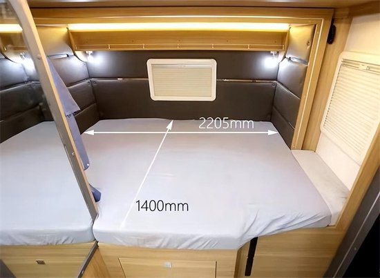 会客区对侧是厨房区,设有整体式橱柜,配备了独立水龙头、赛特福德洗菜池、嵌入式电磁炉、电源插座等,可满足日常烹饪需求;橱柜左侧还配备折叠板,增加操作台使用面积。储物方面设有组合式橱柜+厨房吊柜,可分区存放厨房物品。尾部休息区设有大尺寸横床,拓展后尺寸可达2200x1350mm,可满足多人睡眠休息;床的三面都设置了车窗,采光通风更有保障;侧面同样设有床帘,保证车内人员休息睡眠不受打扰。