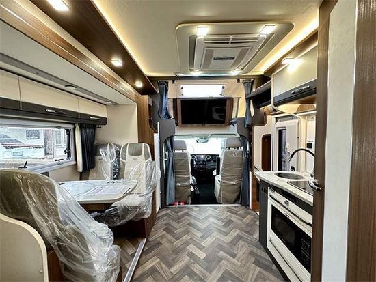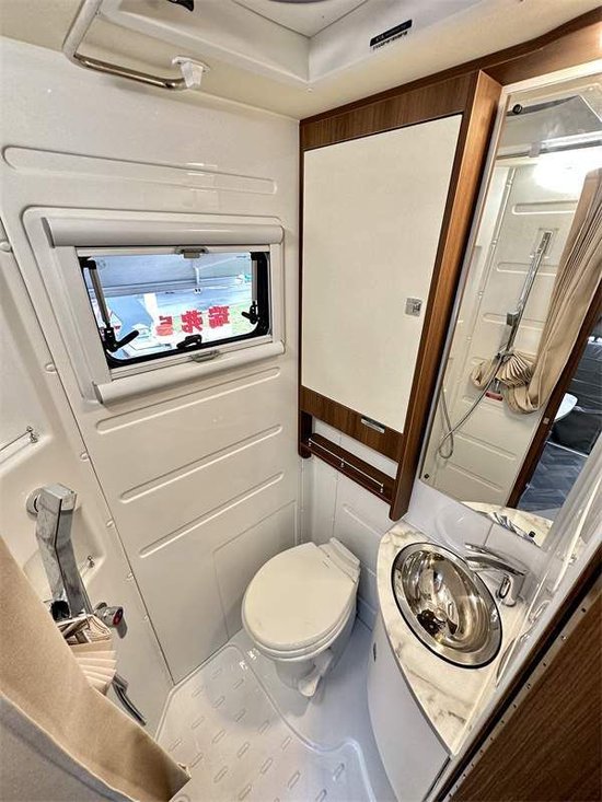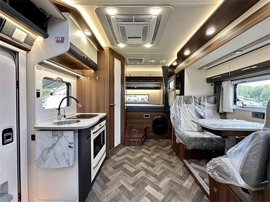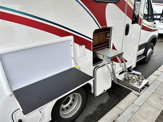 厨房区在这一代新车上最大的变化是取消了固定电磁炉,改为移动式电磁炉,方便在车外使用。新增了额外的翻折桌板,架起了中门和厨台之间的桥梁,可利用空间增大。带盖板的洗菜池,顶部吊柜以及微波炉等都是该车的标配。