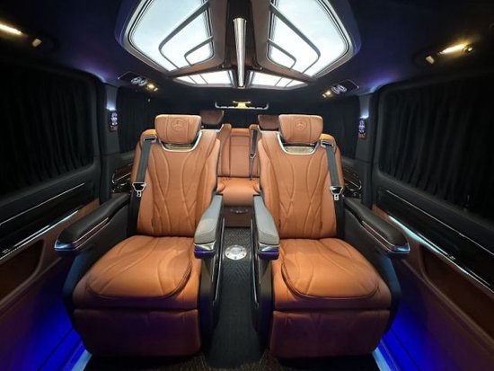 奔驰威霆改装商务车第二排座椅采用两个62S首长级座椅,带加热,按摩,通风,一键式电动调节记忆等功能。奔驰威霆改装七座无隔断座椅符合人体工程学设计,同时带有电动椅背调节,电动头枕,电动前后调节,180°旋转,一键式伸缩腿托功能,带来头等舱级舒适体验,,私家客厅级后舱体验,180°旋转后可以与第三排电动沙发床进行无缝拼接,满足两个成年人一个小孩的正常休息,带来卧室级舒适享受。