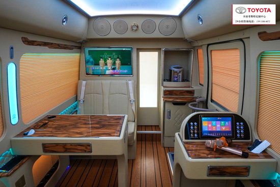 丰田考斯特改装商务车在外观上大气端庄,是集载人客车、商务车、房车等功能于一身的特种车型。为了让乘坐更加舒适,丰田考斯特(丰田考斯特)拆去了原车简陋的织物座椅,配置了更加舒适的航空座椅,360度可旋转的首长席座椅舒适柔软,增加了自动加热、调节角度的功能,为您减轻旅途的疲劳。