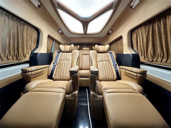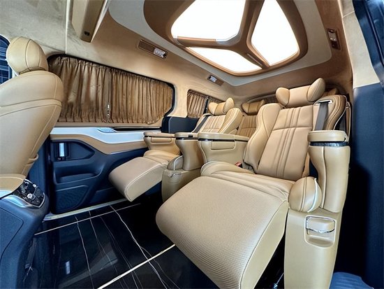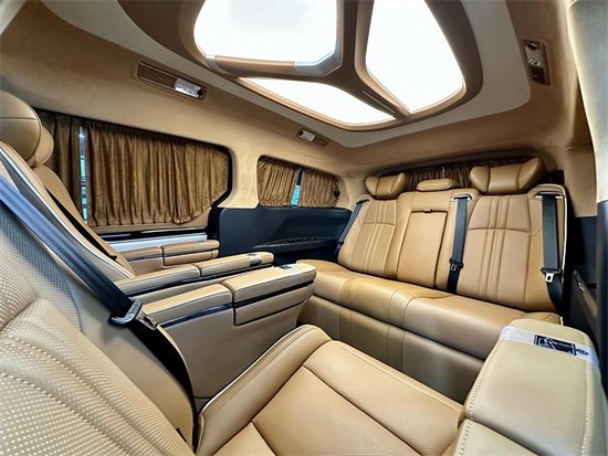 地板采用仿大理石纹地板,车内顶部为采用的是麂皮绒的软包加上星盾天幕顶灯,除了这些基本的功能性以外,整车关注不到的地方,比如四周全部做了隔音的处理,窗户上都加装的是高级私密窗帘,既可以避免阳光的直接照射,维护车内的一个用车环境,也可以很好的保护我们车主的隐私。