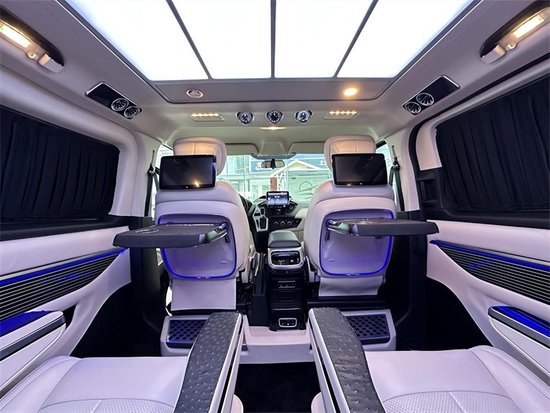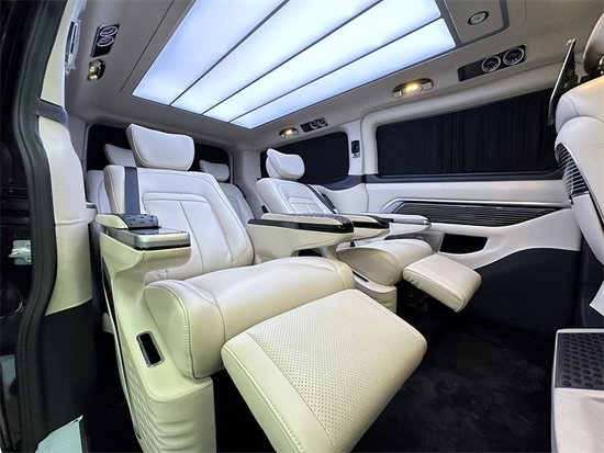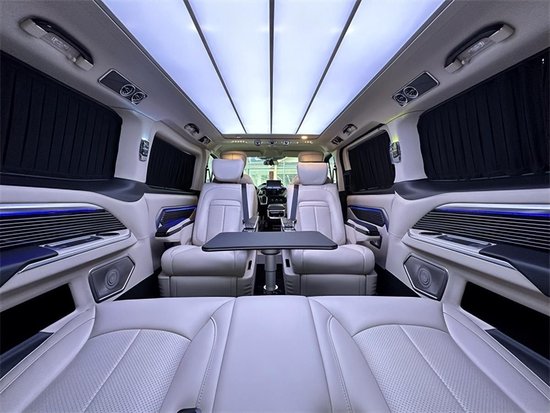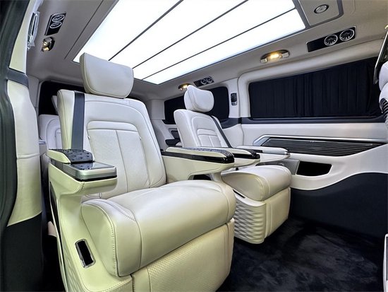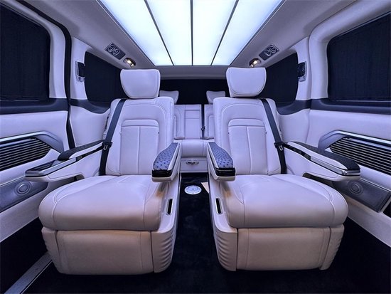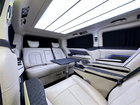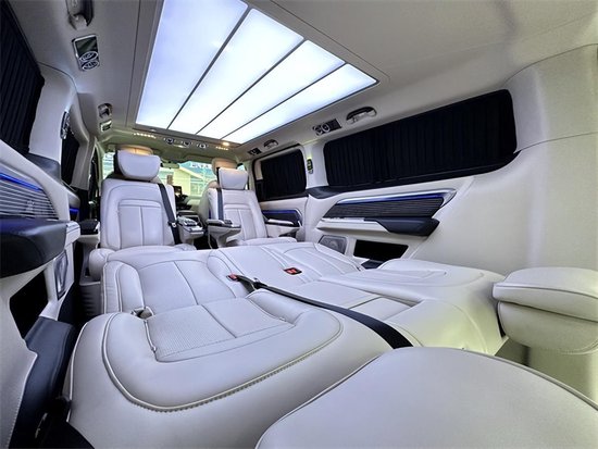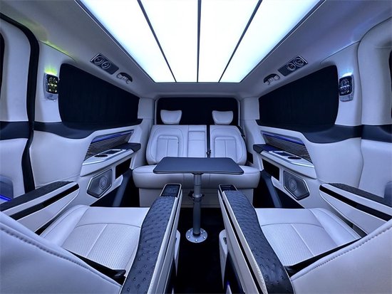 内饰采用手缝双线头层皮革,彰显品位与格调;定制后舱航空座椅采用全冲压结构座椅骨架,具有通风、加热、按摩、旋转、电解锁等功能。座椅布局同样多种可调。而在休息的时候,车辆座椅支持放倒,旋转,解锁更多车内乘坐体验。细节处理更加优秀,车顶可以为用户提供不同风格的选装服务,车辆在没有天窗的情况下可以选择自己喜欢的顶灯。