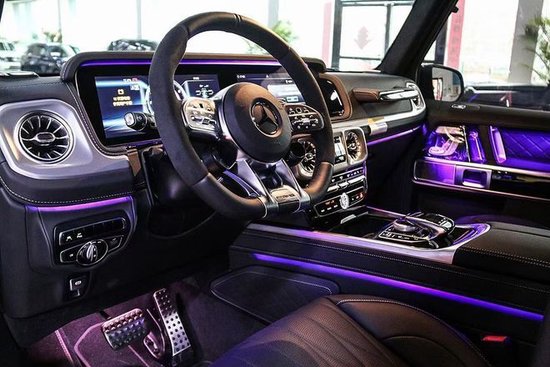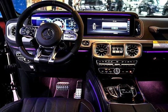 全新G63内饰方面,新G63保留了新G500的整体设计,除配色差异外,新车 还换装了全新造型的平底式AMG运动方向盘,其两侧配以打孔皮质包裹,下部镀铬装饰的造型也与新G 500明显不同,看上去十分战斗。
