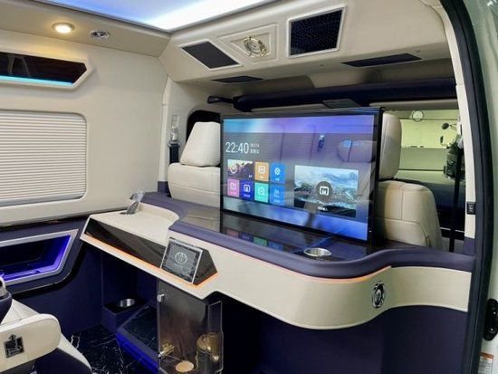 丰田海狮整车升级了加强型的隔音隔热处理,车内带空气净化系统,无线充电系统。在进门侧加装了氧化铝脚踏带迎宾灯的,华通丰业整车都是采用纳帕级皮质进行包覆的,侧壁红木装饰,手动百褶窗帘,后舱暖风系统,棚顶灯光,智能触摸控制系统。埃尔法同款独立航空座椅具备(通风,加热,腿托,旋转)等功能。