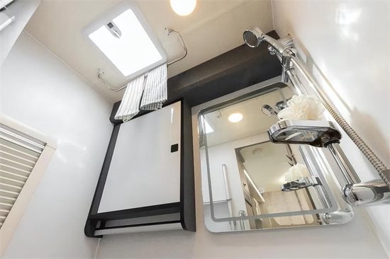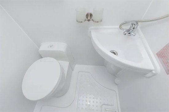 卫生间淋浴花洒、集便式马桶、洗手盆,浴室镜、手纸盒、毛巾架、垃圾桶和马桶刷等配置满足乘客的洗浴需求,保证乘客的生活更加便捷。配备储物吊柜,换洗衣物、洗浴用品和卫生用品等常用物品都可以存放在此,防潮又干净。卫生间顶部还设置了折叠式晾衣架,搭配暖风出风口和车窗,清洗过的衣服可以更快晾干。