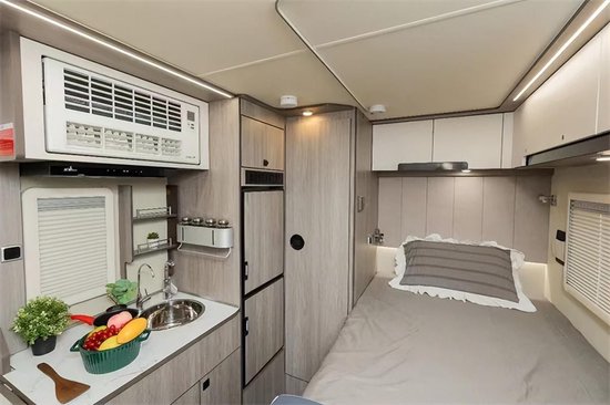 享受在路上的自由和舒适,您需要一个宽敞明亮的休息空间。驾驶室上方的额头床可达到755mm高,尺寸为2210*1450mm配有优质床垫,休息舒适。带遮光帘的手动房车天窗让清晨的阳光和星空的美景随时可见。两侧外推的窗户方便通风,让整个空间充满新鲜空气舒爽宜人,将是您旅途中最放松的角落。
