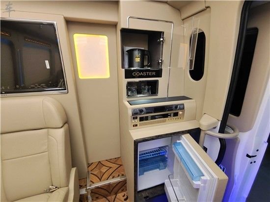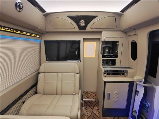 丰田考斯特改装商务车,贴心的设计周到的考虑,为我们的行车提供了以讴歌舒适的环境。在对于内饰的其他装饰上,丰田考斯特改装商务车也是充分体现了自己的不同。百褶窗帘的简单大方,豪华的布艺窗帘的尊贵和美观。绿色灯光的宁静,或者是粉色灯光的温馨。木质地板的整体舒适,或者是通道地毯和蓝色灯光的通道压条的完美统一。丰田考斯特改装商务车内饰上的设计都充分体现了作为商务用车的贴心之处。