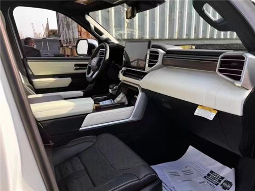23款丰田红杉四辐式多功能方向盘、并保留了很多物理按键、足以满足驾驶时想要的操控感、车内的科技氛围是通过12.3英寸的全液晶仪表盘和14英寸的中控屏来实现的、中控屏两侧的空调出风口、虽然没有采用时下流行的贯通式设计、但在中控台上对称排列也别有一番风味。