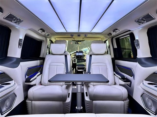 同时车厢顶部有多色可调的顶灯和64色氛围灯,配合隐私玻璃和车身窗帘,共同实现车内明暗度整体可调。后排空调出风口和音响系统也全部集成在车顶上方。与原厂全顺 (配置|询价)追求极致的空间感不同,克蒂帝亚根据消费者对豪华商务车型的情感与功能需求,为商务通勤和家庭出游场景提供自己的最新方案。