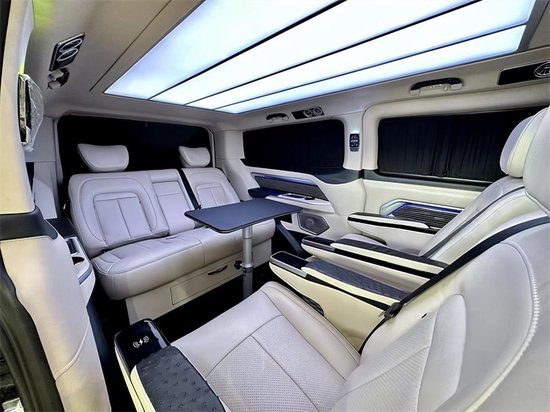 定制后舱航空座椅采用劳斯莱斯库里南 (配置|询价)同款座椅,具有通风、加热、按摩、旋转、电解锁等功能。座椅布局同样多种可调。而在休息的时候,车辆座椅支持放倒,旋转,解锁更多车内乘坐体验。细节处理更加优秀,车顶可以为用户提供不同风格的选装服务,车辆在没有天窗的情况下可以选择自己喜欢的顶灯。