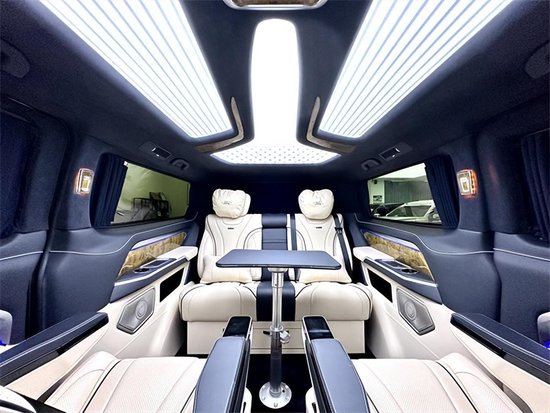 车厢内整个顶灯尺寸超大,从第二排一直延伸到车尾。光源多级可调,配合隐私玻璃和车身窗帘,共同实现车内明暗度整体可调。高顶车型的后排空调出风口和音响系统也全部集成在车顶上方。高端手感漆喷涂,手感相当细腻、平滑,外观雅致,耐划性、耐侯性、耐磨性优良。这些都体现了帝亚系列的细节做工和品质,营造了一个具备高级感的内舱氛围。