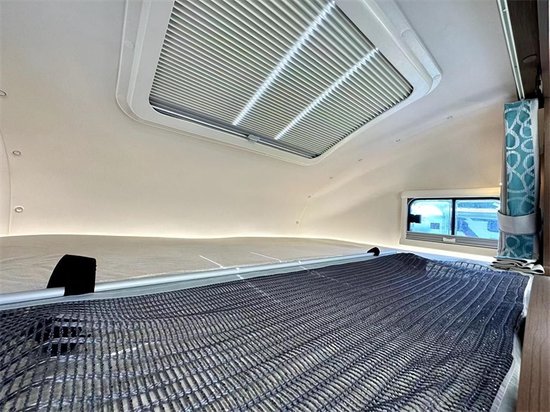 内饰布局采用的是客厅L型沙发座椅+后纵置双人床+额头床,是一般常见的布局,内饰家具则采用深色系列;驾驶上方是常见的额头床部位设计,配置了大尺寸弧形外推窗、两侧小尺寸房车窗、防护栏等,提供舒适的卧室环境;床板向上翻折后是32寸的高清液晶网络电视屏。