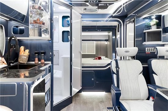 会客区的亮点是配备两张蓝白相间的独立式航空级座椅,具备电动六项调节及腿托调节,具备通风、加热、按摩功能,加上宽大的包围式头枕带来了极佳的长途乘坐体验。座椅上方布置了三段式储物柜,方便放取随身物品。得益于双拓展的宽大空间,车内不但有一台隐藏式的32寸电动升降智能电视,升降的过程很有科技感,还出乎意料的设置了一台极米超清投影仪与60寸电动幕布的搭配,让你的房车瞬间变成移动影院。