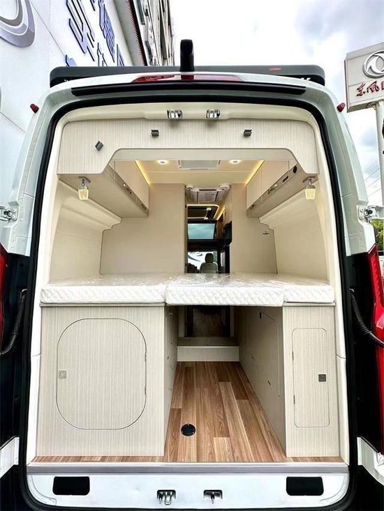 后门依旧采用了大通V90双开门的设计,车内装饰整体采用航空级别模具吸塑件,告别传统的软包和贴皮,环保造型有了更好的提升。后横床的布局带来底部较大的储物空间,床铺中间位置采用可翻折的灵活设计,甚至能当作一台“搬家工”来用,小型电动自行车和普通自行车都可以装得下。在底部左侧的位置也预留了洗衣机的开口,可以说尾部空间的可塑性还是不错的。