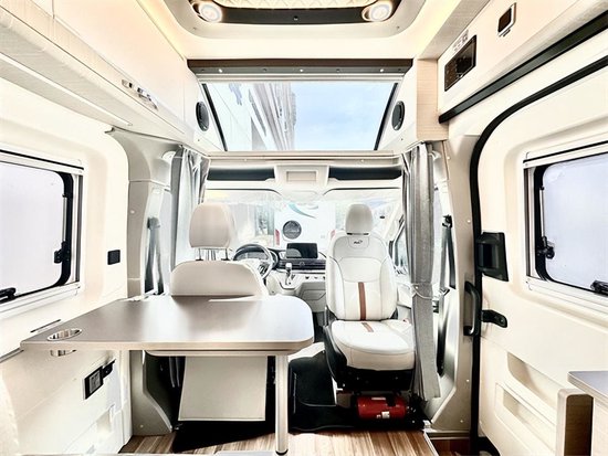 车内采用单排座椅卡座和后横床的布局,厨房和卫生间分布在中间区域的两侧。厨房台面内嵌带砧板洗菜盆、高弯水龙头、电磁炉,侧方带延展桌板。厨房的上部是12V直流变频空调。车内配备米家微波炉、85L双开门车载冰箱。在微波炉上方及冰箱下方各有一个储物柜,顶部配有多个通风天窗,满足车内空气净化需求。对于B型房车而言,尽可能多的储物空间非常重要。过道最宽处能够达到53公分。顶部配有美国MAX双向换气扇,在行驶中可使用,是非常实用的配置,建议大家的车内都配备。过道区的另一侧是一间一体吸塑式的卫浴室,宽75公分,进深70公分,高1.9米,一个成年人洗漱还是完全没有问题的,配备了马桶,淋浴花洒,可翻折的洗手池和带玻璃门的储物吊柜等设施,完全可以满足出行的洗漱需求。