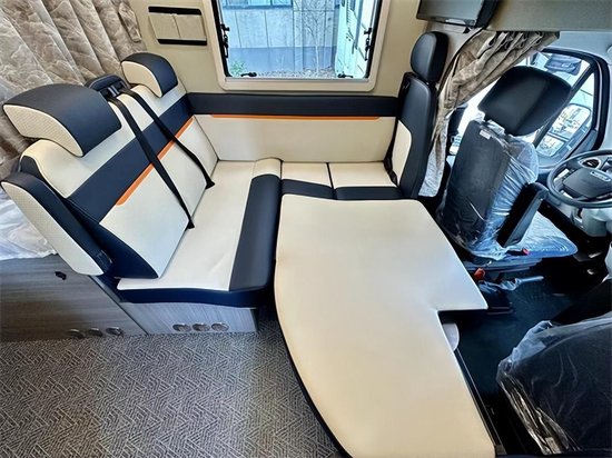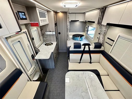 生活区由额头床、会客区、厨房区、卫浴区、后置拓展横床组成,这种布局形式我们已经非常熟悉了,侧、后拓展舱可最大程度延伸客厅和横床面积。车厢整体使用蓝白现代的色彩其间穿插板材本身的原木色来增添车内质感。车厢内部选择了黄檀新内饰的设计,都使用了浅木纹的家具颜色,搭配米白色的装修风格,整体风格都非常的时尚亮眼。