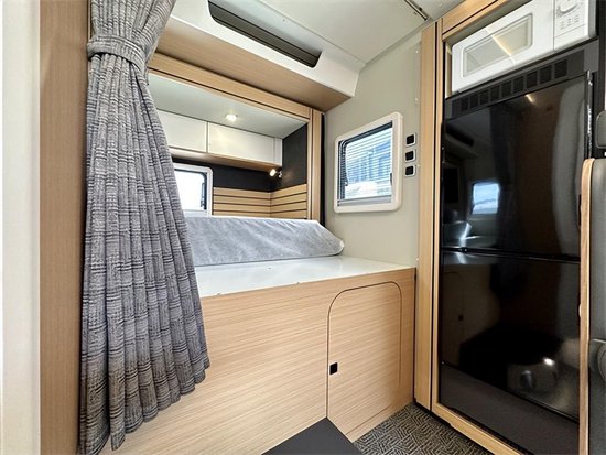 后拓展仓伸出后,后置横床就变身为一张舒适宽敞的双人床位,全车床垫均使用了高密度海绵,睡感柔软舒适且不易变形,床头两侧配有LED灯和电源插座,方便夜晚阅读聊天,具备亮度和角度调节功能。