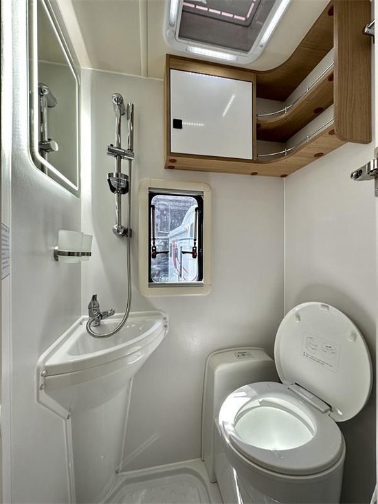 卫生间的空间还是不错的,可以满足一个成年人的正常洗漱。配置也基本齐全,主要有便携式马桶、淋浴花洒、置物架、毛巾架、梳妆镜以及顶部的换气扇。但未配置洗脸盆,这个可以支持选装。毕竟这是一款宇通房车打造的房车,可以享受宇通优质的售后服务。
