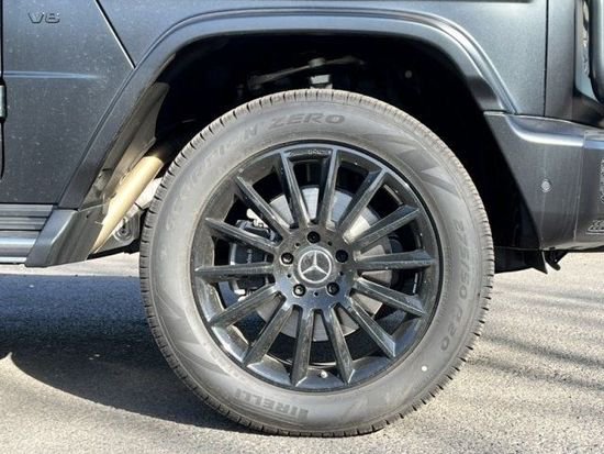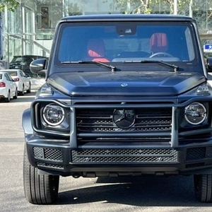 2023款美规奔驰G (配置|询价)550外观采用奔驰家族式的设计风格,黑色车漆涂装让它看起来非常亮丽,方正的车头造型搭配圆形大灯,给人很硬派的感觉,中网格栅采用横幅条设计,外凸前保险杠设计很有越野范。