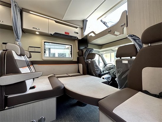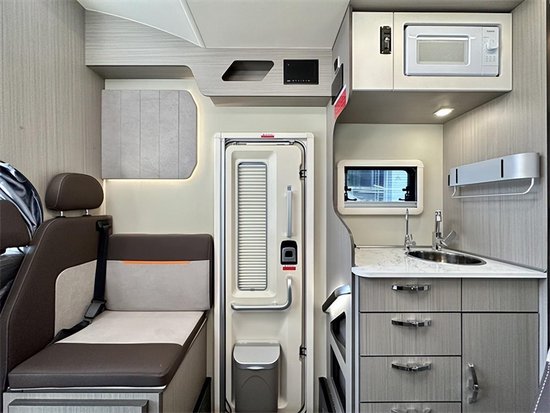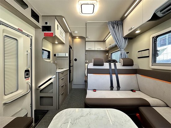 科技灰环保板材与米白色内饰搭配,为车内营造出居家般的生活感,空间虽不及拓展房车,但L型卡座会客区、前额头床、中央厨房、后子母床(或者后纵床)及一体式卫生间等生活配置一应俱全,同时整车外推窗均配备有私密拉帘,有效保障旅途中的隐私。会客区采用L型布局方式,基于人体工程学设计,外侧配有扶手;中间为固定餐桌;沙发内侧墙壁上有窗户,推窗上方有储物柜,方便日常使用。并且在休息时可对其放平成床进一步增加我们的休息空间。
