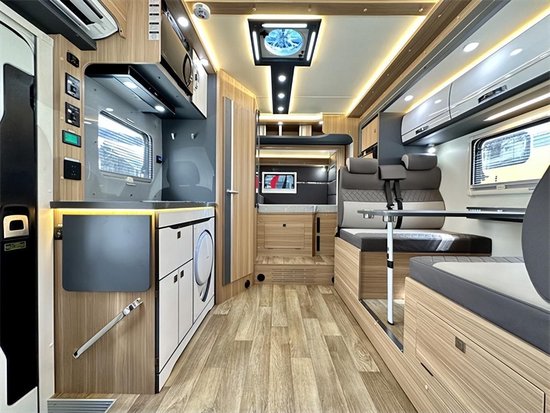 进入到室内,整体内饰风格是实用化的家具温馨风,深灰色沙发包覆和深灰色家具饰板搭配白色光源,大部分家具饰面以原木风格为主色调,整体看起来十分温馨。驻车后打开拓展机构,内部空间十分大。布局方面,由前置额头床、会客区、厨房区、卫浴间、尾部睡卧区组成,布局清晰,各区域功能齐全,只为带给乘客高品质的旅居生活。