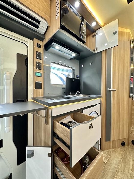 厨房区域内嵌电磁炉及赛特福德带盖洗手池,主台面右侧可拓展一张35x50(cm)的置物台,进一步扩大了厨房操作面积。卫浴间独立式设计,配置了欧式折叠水槽,节约空间,增大卫生间内部的可使用面积、房车专用马桶、毛巾架、置物格、储物柜都有配置,满足日常的洗浴和如厕需求。储物柜上是镜子设计,有效增大视觉效果。