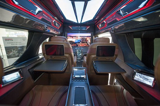 GMC商务车而打开车后门,呈现在眼前的便是一个大储物空间。进入前车舱,中国制式仪表盘、便捷式档位,以及桃木装修的中控台规划给人简洁而健康的感觉。桃木/真皮镶嵌方向盘、透气型奢华真皮航空椅、前置车载冰箱的选用,显示了奢华气息。