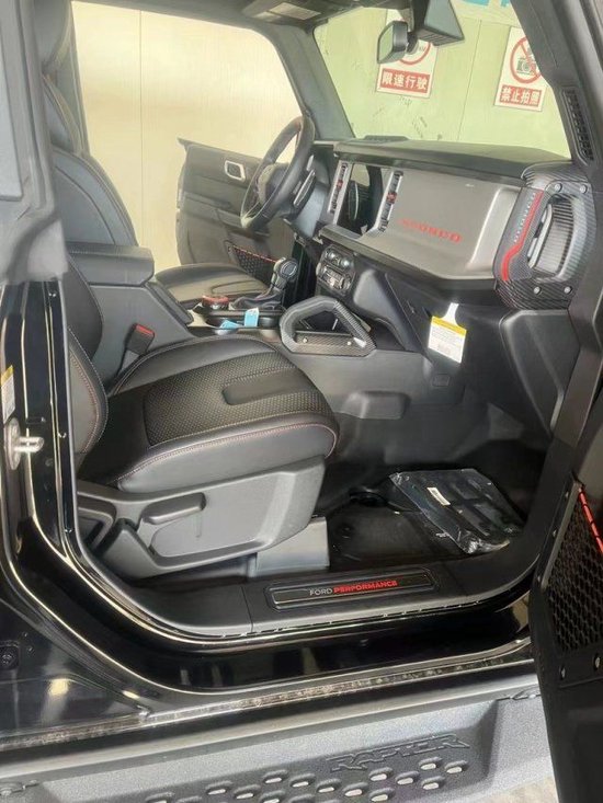 23款福特烈马Bronco3.0T四门Raptor猛禽车内采用硬朗的设计风格,中控台设计主次分明且有层次感用料也厚实。多功能方向盘造型运动,中控屏幕采用内嵌式的设计增添了车内的时尚感,按键布局合理档把设计精致座椅宽大厚实空间宽敞实用性强。