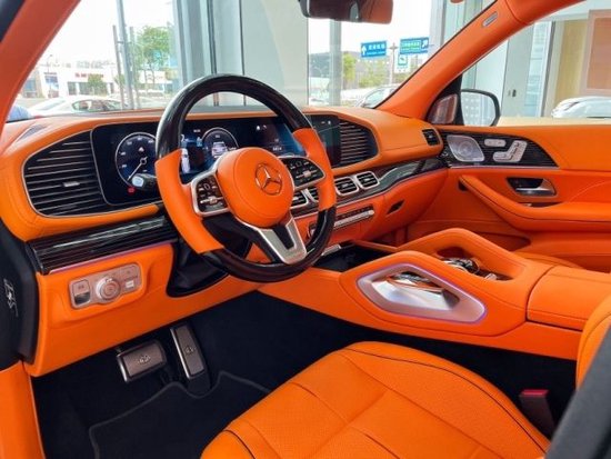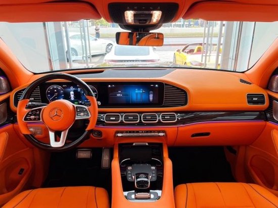23款奔驰GLS450改装升级四座内饰整体皮饰改成了爱马仕橙色的设计,替换了钢琴黑条纹桃木饰板,桃木方向盘,加装了HUD抬头显示系统,主机系统也刷了迈巴赫的开机画面,车内随处可见的迈巴赫标志,打造无出其右的考究质感。