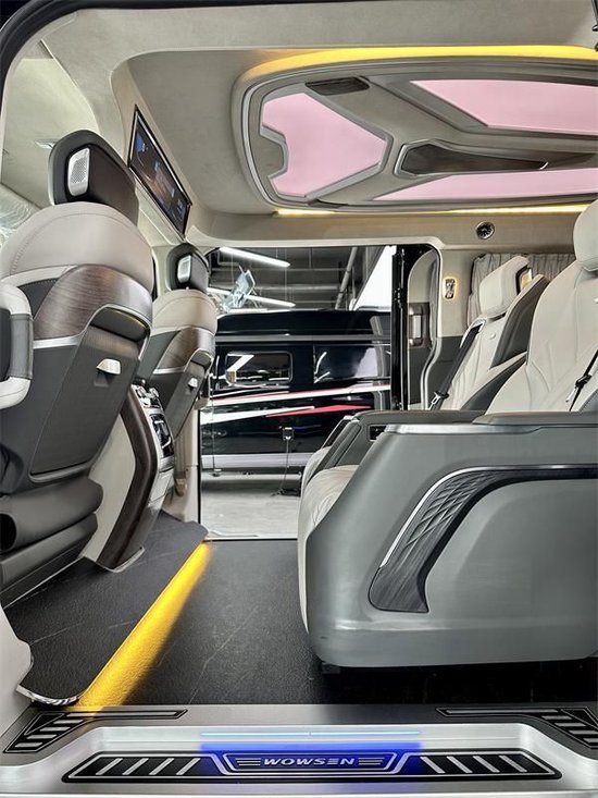内饰方面wowsen沃森威尔的飞机头等舱航空座椅,高密度的耐磨材料地板,具备隔音性好、保温性好等特点,水洒在上面不易渗透并可及时清理,还可以隔绝轮胎行驶过程中产生的80%的胎噪,使车内达到最佳的舒适环境。车顶独家开版的高达顶灯,冰蓝、极光白、暖橙三色可调,亮度调节有三档,顶部还配备了24寸的智能液晶显示屏,可以同步车辆的车速、时间。进行智能办公、上网追剧等,满足你行车空间的所有娱乐休闲需求。好了本款全新沃森威尔福特黑武士豪华七座商务车小峰哥就同大家介绍到这里。阅览世间美好,带您跨越山河,品味人间烟火,给您一个移动的家 -我是小峰哥