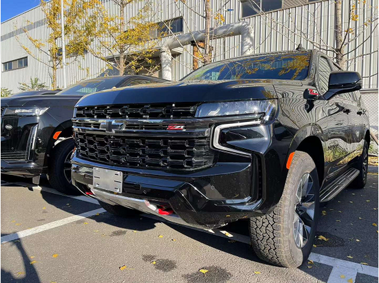 22款雪佛兰萨博班外观造型设计还是以方正风格为主,车头横纹镀铬进气格栅气场不输凯迪拉克凯雷德 ,两侧更狭长的LED矩阵大灯光源很犀利,搭配小獠牙日行灯装饰,车头侵略感比较强。车身侧面属于很明显的全尺寸SUV身材,新一代产品比老款车型轴距增加了105mm,C柱后方超大面积侧窗与凯雷德如出一辙,搭配隔音隐私玻璃和平坦的车顶行李架,沉稳的气场很突出。