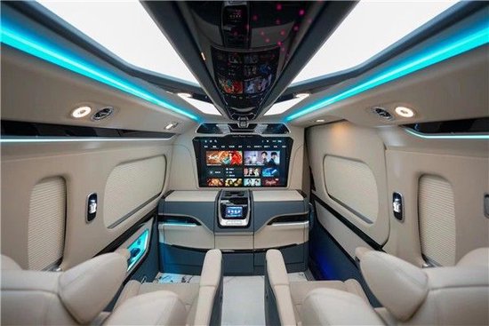 丰田海狮车内搭载42寸高清液晶电视,高级吧台配有液晶触控屏调节车内操作,吧台同时配有隐藏秘书座椅,让商务生活更充实。车顶设计浩瀚星空顶氛围灯,灯光多色可调。整车内饰车窗选用高级麂皮绒窗帘,柔软舒适。